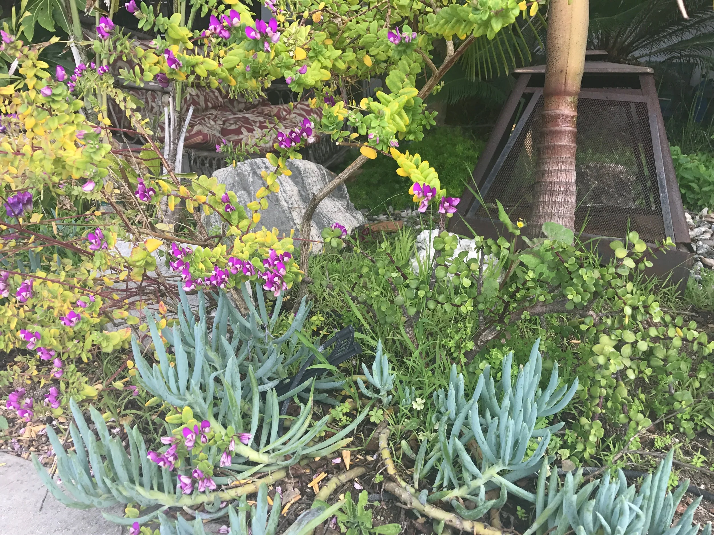 A garden with various plants including purple flowers and succulents, a stone, and a rusted outdoor heater, with a palm tree and grass in the background. Detailed annual maintenance on residential property.