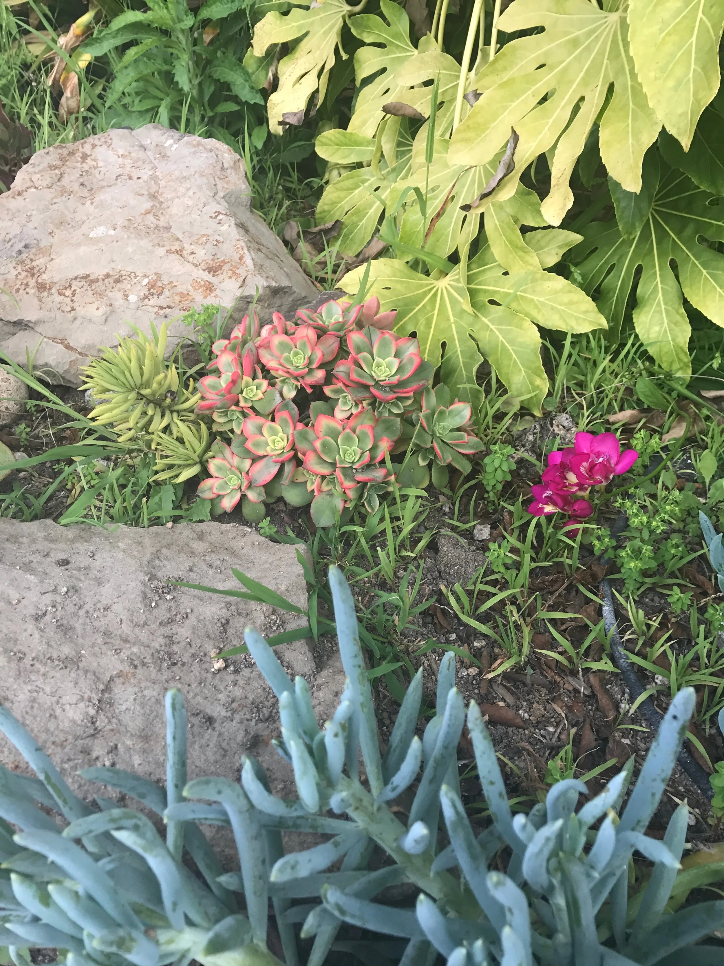 A garden with variegated plants and succulents, including a pink-flowered plant, a blue-gray succulent in the foreground, and a large leafy green plant in the background, with rocks and soil.