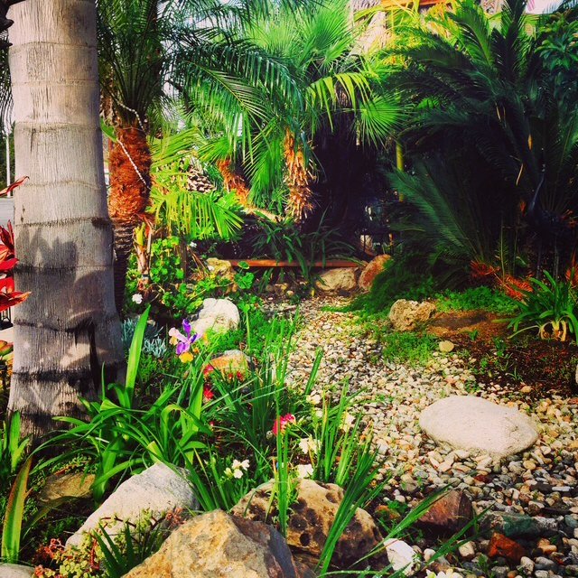 Tropical garden with palm trees, various green plants, colorful flowers, and large rocks along a pebbled pathway.
