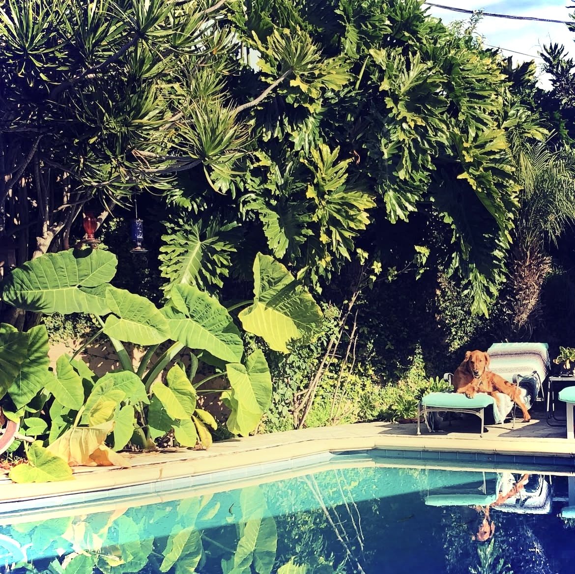 Detailed annual maintenance on residential property. A backyard swimming pool with clear blue water reflecting the surrounding greenery, and large tropical plants and bushes around the area.