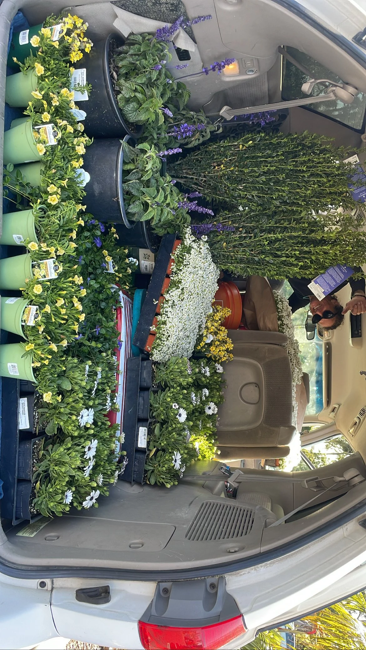 The image shows the interior of a vehicle filled with various potted flowering plants, including daisies and other colorful blooms, ready for sale or transport.