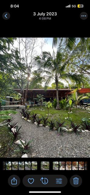A tropical garden with palm trees, lush green plants, and a small gravel pathway leading to a wooden structure, surrounded by tropical vegetation.