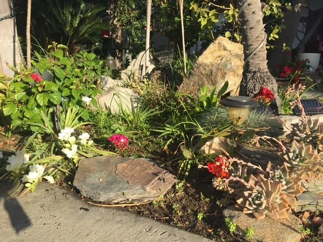A garden bed with various flowering plants and succulents, surrounded by rocks and a concrete pathway.