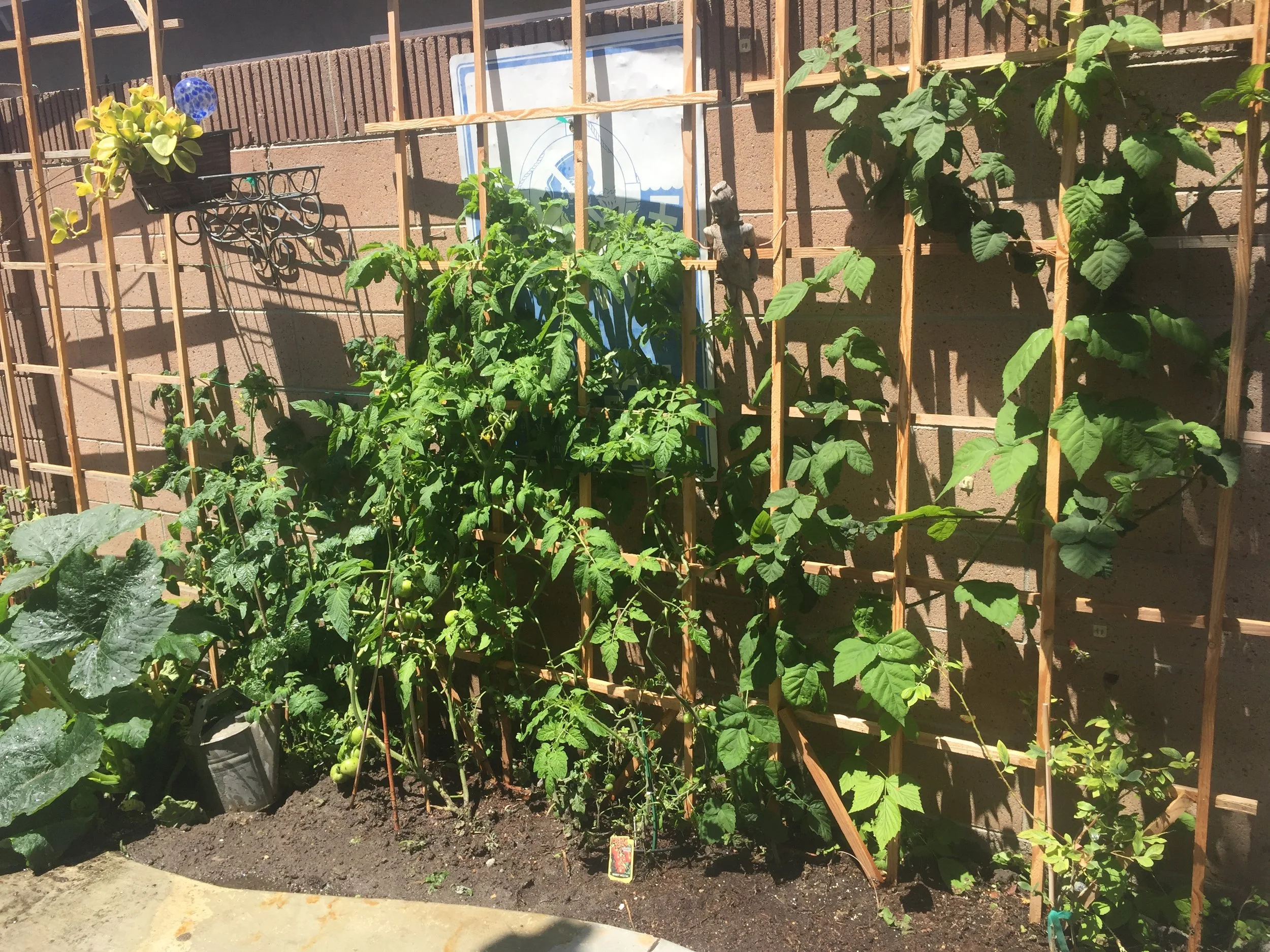 Green leafy plants, including tomato plants, grow in a garden with a wooden trellis against a white wall. A window with an angled frame is visible in the background.